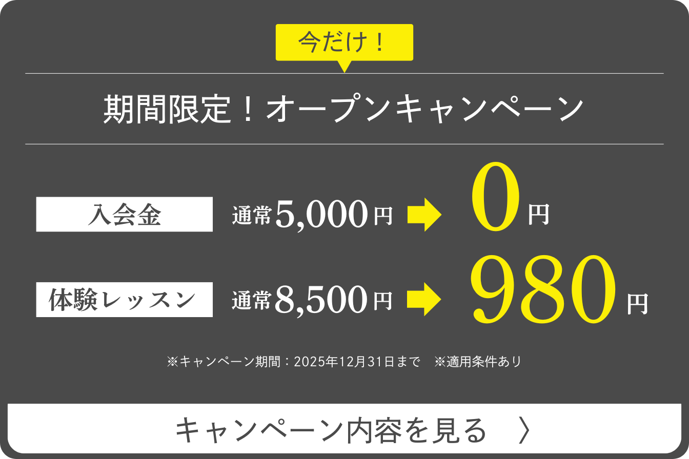 - 初回体験レッスン(80分)8,500円キャンペーン価格:980円 ※先着30名様限定