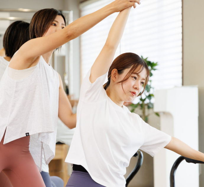 ご安心ください。me time pilates では、運動経験がない方や体力に不安のある方でも安心して始めていただけます。理学療法士監修のプログラムをもとに、インストラクターが一人ひとりに合わせた無理のない内容をご提案します。